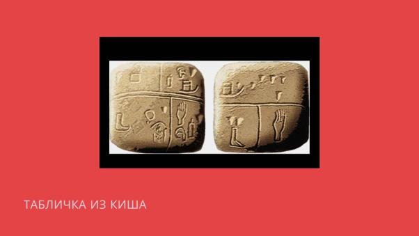 Памятники шумерской письменности являются древнейшими в мире. Табличка из города Киша датируется примерно 3500 г. до н. э. – это еще пиктографическое – рисуночное письмо.