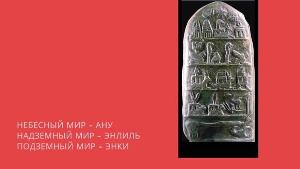 Когда им стало тесно на горе, Энлиль отделил небо от земли. Ану стал править небом, Энлиль – надземным миром, а его брат Энки – бог мудрости – пресными подземными водами.