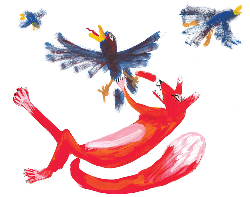 Как лиса ловила ворон.Однажды лиса решила поохотиться. Она легла на землю, подняла лапки, закрыла глаза и притворилась мёртвой. Вороны увидели лисицу и стали над ней кружить. Одна самая любопытная ворона летала очень низко и наконец решила сесть на лису. Внезапно лисица вскочила и схватила птицу за хвост. Остальные в испуге разлетелись. Так, благодаря своей хитрости, лиса поймала ворону.