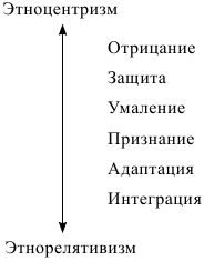 Также в построении данной модели мы считаем удобным использование модели Милтона Беннетта для описания тех изменений личности, которые происходят в контексте поликультурной среды, или так называемой модели освоения чужой культуры. Его модель достаточно наглядно представляет процесс, который описывает изменения, происходящие с личностью в ситуации межкультурного взаимодействия. М. Беннетт описывает освоение чужой культуры как прохождение от стадии этноцентризма к стадии этнорелятивизма.