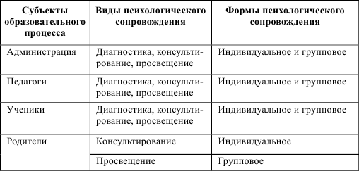 Особенность психологического сопровождения субъектов образовательного процесса опирается на парадигму психологического сопровождения, описанную М. Р. Битяновой, – ее подход не противоречит модели психологического сопровождения поликультурного образования и включает в себя следующие формы и виды психолого-педагогического сопровождения субъектов образовательного процесса.