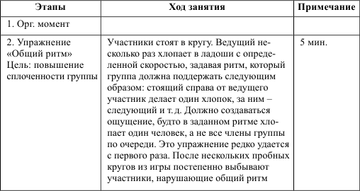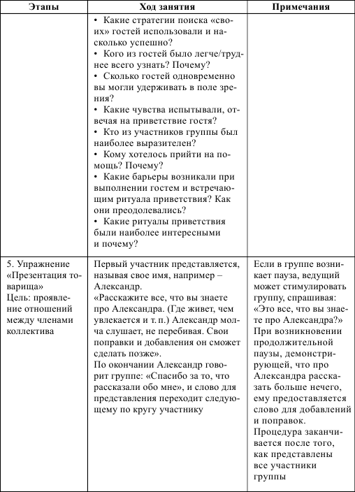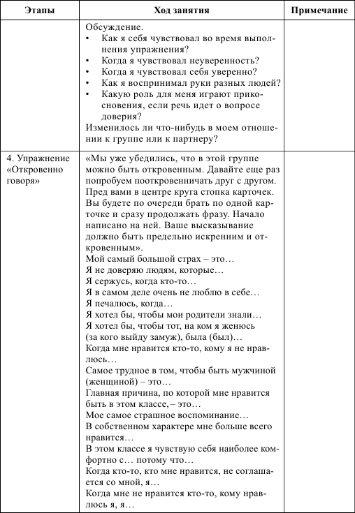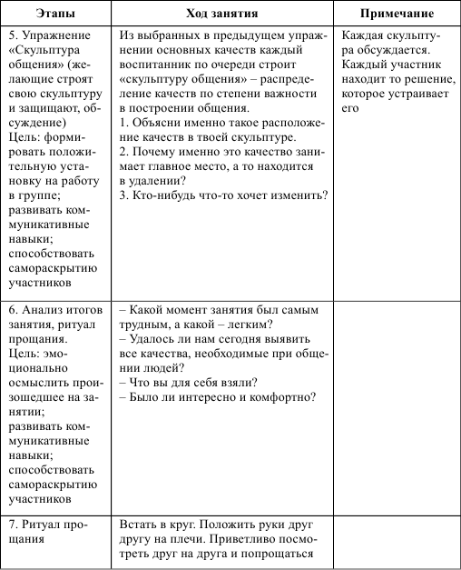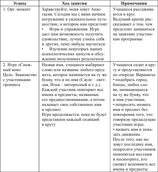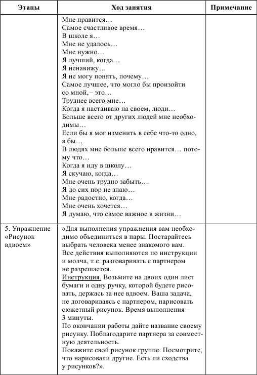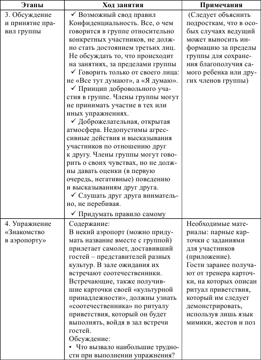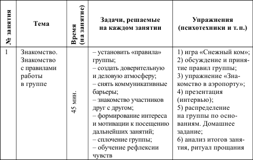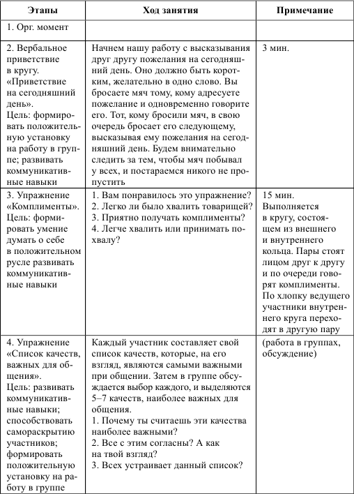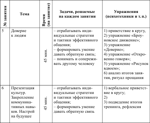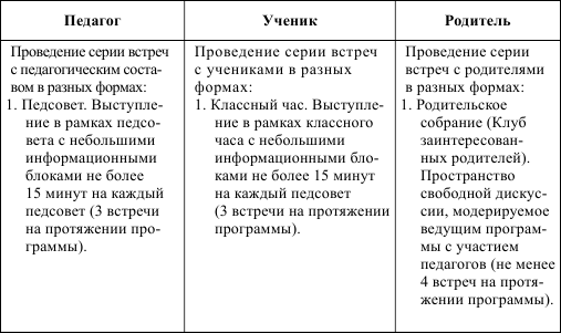 Содержание тренинговых занятий для педагогов и учеников – различно. Основное различие будет проходить по линии профессиональной коммуникации педагогов с учениками. Однако, если будет существовать организационная возможность, в некоторых встречах возможно пересечение всех участников программы: педагогов, учеников и родителей. Наиболее открытой площадкой для такой встречи являются выездные мероприятия школьников, но также возможны и пересечения в рамках отдельных занятий тренинга. В целом содержательное наполнение конкретных упражнений тренингов для учеников может базироваться на материалах существующих публикаций.