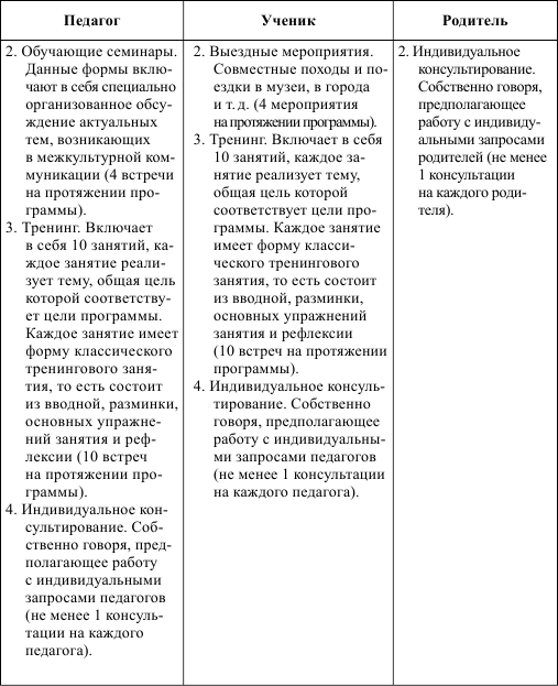 Необходимо отметить, что деятельность психолога в контексте поликультурной образовательной среды безусловно включает в себя все классические виды и формы, подробно описанные у М. Р. Битяновой в ее книге «Психолог в школе».