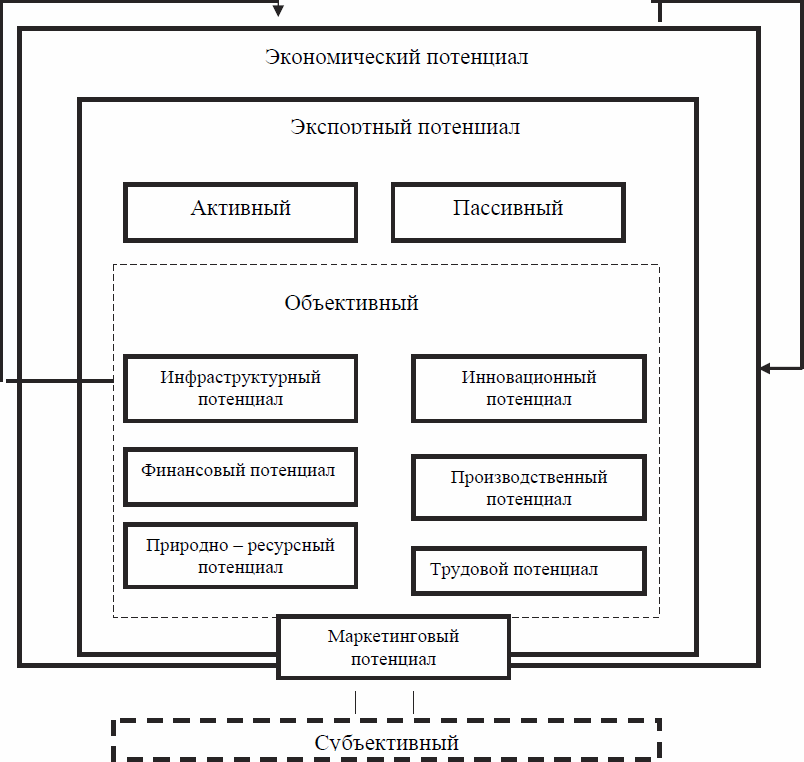 Экспортный потенциал состоит, во-первых, из совокупности природных, трудовых, материальных и нематериальных ресурсов, имеющихся в наличии, вовлеченных и не вовлеченных по каким-либо причинам в экспортную деятельность; во-вторых, из мотивации и способности хозяйственного механизма осуществлять воспроизводственный процесс и эффективное использование необходимых ресурсов именно в экспортной деятельности.