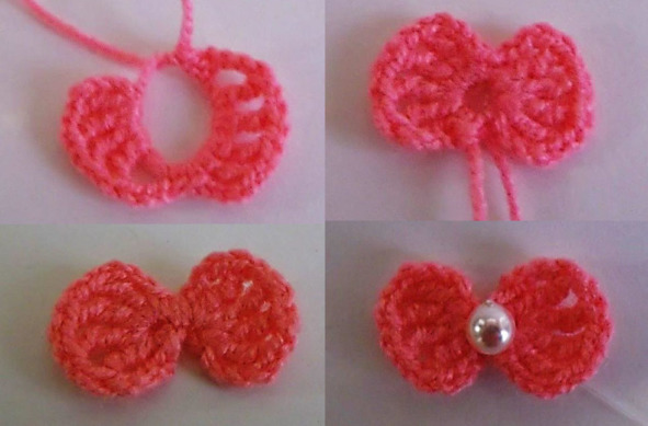 Кольцо стянуть, нити от начала и конца вязания завязать между собой, одной из нитей сделать перевязку между одной и второй половиной бантика, завязать нити, обрезать. Пришить бусинку.