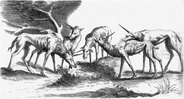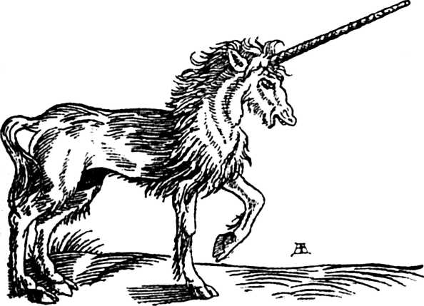 Но самым свирепым зверем является единорог (monocerotem), голова которого напоминает оленью, а все остальное туловище похоже на лошадиное, со слоновьими ногами и кабаньим хвостом. Единорог мычит низким голосом, а из середины лба у него растет черный рог длиной два локтя. Говорят, что живым это животное поймать невозможно.