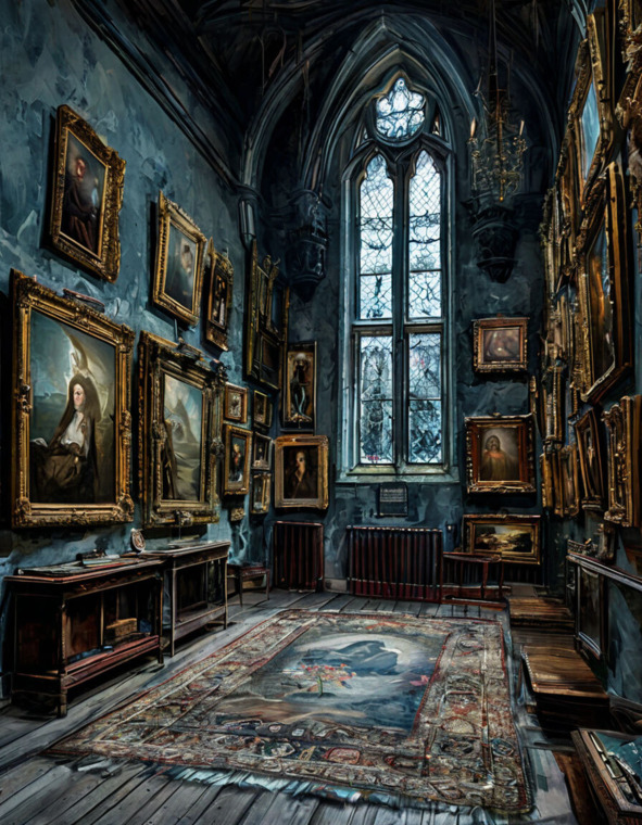 Огромная комната, словно бесконечная, простиралась вдаль, теряясь в тумане времени. Я потёрла глаза, но странный эффект не исчез. Высокие потолки, украшенные фресками, изображавшими великие моменты истории, навевали чувство благоговения. Солнечные лучи, пробиваясь сквозь цветные витражи, освещали пространство мягким золотистым светом, придавая ему еще более таинственный вид.