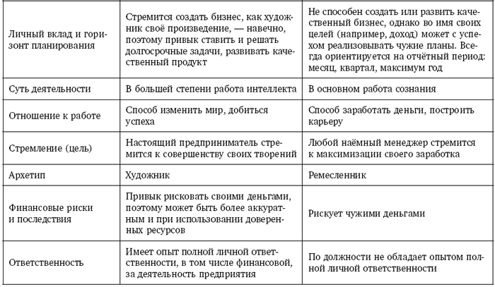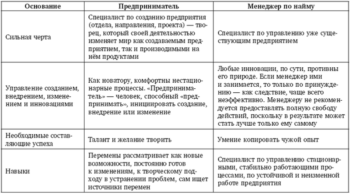 В то время, пока предприниматель создаёт, стремится, рискует, творит и мечтает изменить мир, менеджер по найму управляет уже существующим, исполняет, копирует и, если и рискует, то только чужими деньгами.