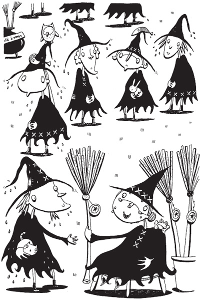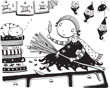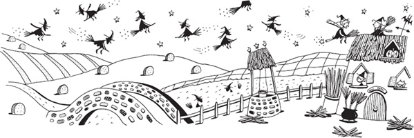 “My first broom,” she was saying, “the Walpurga Basic, had only eighteen twigs, me dears, but it’s still a cracker. But you might prefer this one, the Walpurga Special. It has a Cauldron Hook, an Adjustable Seatbelt for your mascot and a very useful Air Bag (for those unavoidable crash-landings). Or perhaps,” she cackled, “some of you zippier types would like the Walpurga High-flyer for some extra oomph on the Milky Way. Go on,” she said encouragingly, as she passed her brooms around, “have a whirl! Have a test drive! Ig-Fo-Li, that’s it. Ignition, Forward and Lift. Whoops! Re-Pa-De. Reverse, Pause, Descend. There you go!”