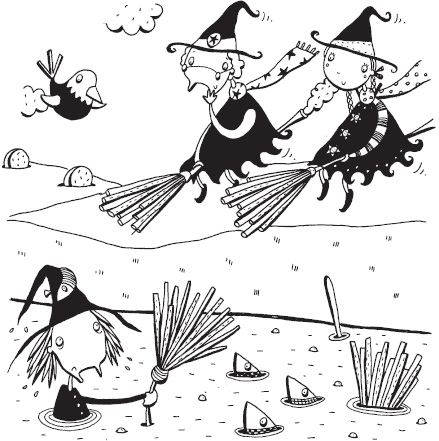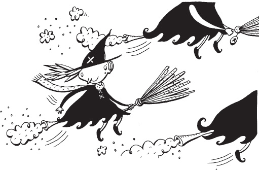 Jessica floated off the roof. To her surprise, the sky was filled with witches hurtling from north, south, east and west, all flying the Wrong-Way-Up on old-fashioned broomsticks. They whizzed past with centimetres to spare, muttering crossly and spitting nails. Jessica had to use both her Duck and Dive twigs to avoid bumping into them.
