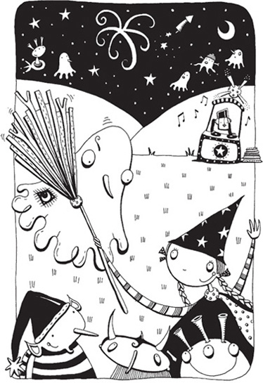 Hiding behind the goblins’ burger stall, she peered into the spikes of the broom. She turned it upside down and round and round. She pressed her fingers along the handle and tweaked the twigs. It certainly didn’t look as if it could fly. It was just a plain old-fashioned broomstick.