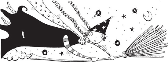 At home, Jessica hurried into the kitchen and rummaged about under the sink until she found a roll of large black bin liners. She fetched Sellotape and scissors and paints. Half an hour later, she was standing in front of the long mirror in the hall wearing her new witch’s cape and her pointy hat, now painted black with gold stars. She picked up the broom and put one leg either side of it.