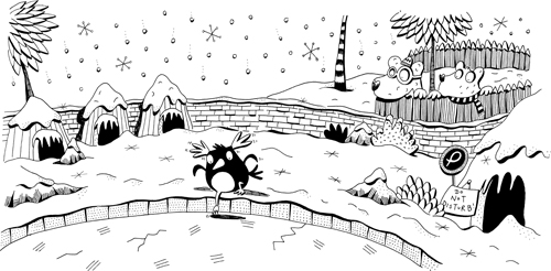It was perfect weather for penguins. It had snowed heavily in the night and the penguin enclosure at City Zoo looked just like the Arctic. The wooden huts where they slept glittered under a frosty duvet like a row of mini igloos and there were icicles hanging off the palace where Big Paulie the emperor penguin lived.