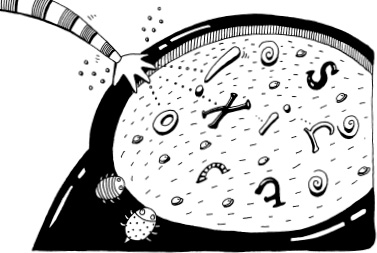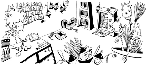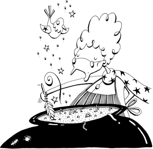 Miss Strega sighed and drank a thimbleful of her own stiff brew. “Now pay attention,” she ordered. “I’m starting to Mingle.” Holding her left hand behind her back like a television cook, she extravagantly sprinkled a few exclamation marks into the cauldron. “Now take the feather of a long-eared owl …”