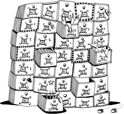 The back wall of the shop was covered from top to bottom in wooden drawers with brass handles and spidery handwritten labels.