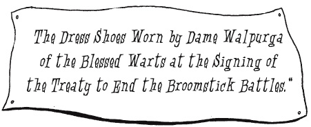 “The treasure, the absolute pearl of our collection, is a pair of shoes that had once belonged to that wonderful witch, the inventor of the Modern Witch’s Right-Way-Up broom, dear Dame Walpurga of the Blessed Warts.