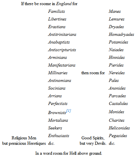 [1] By Brownists I mean not Independents, but dew-clawd Seperatists: farre be it from me to wrong godly Independents. I truely acknowledge that I judge my self neither able nor worthy to honour some of them as they deserve.