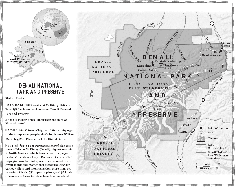 The authors are grateful to so many people at Denali National Park who helped in the creation of this book: Joe Van Horn, Wilderness Coordinator; Diane Brown, Communication Center Manager; Stacey Chadwick, Staff Assistant to Superintendent; Theresa Philbrick, Staff Assistant to Interpretation; Martha Tomeo, Education Specialist; Clare Curtis, Supervisory Park Ranger; Annalie Wright, Park Ranger Protection; Stan Steck, Park Pilot; Doug Stockdale, Public Information Officer; Tom Habecker, Park Ranger; Pat Owen, Wildlife Biologist; Amanda Austin, Biological Science Technician; Chelsie Venechuk, Cultural Resource Technician; Carmen Adamyk, Kennels Assistant; Karen Fortier, Kennels Manager; Paul Anderson, Superintendent; Diane Chung, Deputy Superintendent. A very special thanks to Beth Van Couwenberghe for her generosity in hosting us at McKinley Village Lodge.