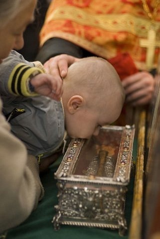 Глядя на эту фотографию, Мне просто делается еще и любопытно: а какую очередь отстояли эта бабка со своим маленьким внуком, чтобы приложить этого невинного малыша губами к грязной шкатулке с чем-то непонятным внутри? Обычно, когда попы выставляют на обозрение и для поклонения какую-нибудь свою «реликвию», то безумцы, называющие себя верующими, стоят на поклонение часами, несмотря на погодные условия.