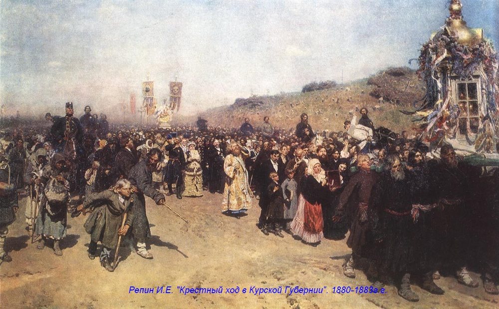 Вот ниже великая картина, великого Ильи Репина – «Крестный ход». Этот народ, изображенный на картине, не имеет будущего! Куда он идет? Только на свою Голгофу! Он не может выжить априори! Это психологическая и историческая аксиома! Гражданская война, ненависть друг к другу – все заложено в нем, все тлеет пока красным угольком внутри его буйной души. И нагайки жандармов, и палка мужика, которой тот строго, даже со злобой куда-то указывает калеке, и сам он, как символ всей русской духовности – все это указывает на путь к пропасти, путь к самоистреблению. Ибо эта религия, это Православие, никуда больше завести и не сможет, как бы их представители не убеждали вас в обратном.