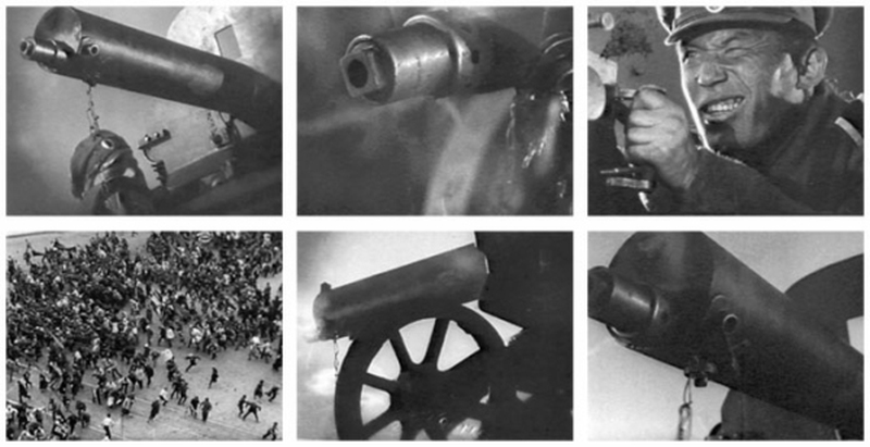 Эйзенштейн довел до предела экспериментальную проверку такого эффекта в фильме «Октябрь» – в эпизоде расстрела демонстрации 3 июля на перекрестке Невского проспекта и Садовой улицы. Он несколько раз повторил монтаж сверхкоротких кадров (по две клеточки каждого: пулемета, снятого в разной крупности и в разных ракурсах, или пулемета и крупного плана лица пулеметчика), добившись визуального эффекта двойной экспозиции (симультанного восприятия двух кадров) и впечатления звука (дробной трескотни пулеметной стрельбы). В целом же это решение создало образ «имперсонального» насилия правительства над проявлением народного протеста.