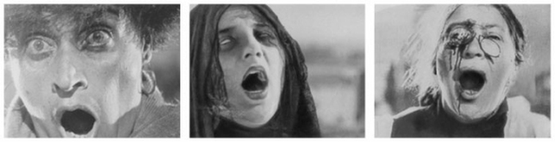 А во второй половине этого акта – в эпизоде расстрела мирных одесситов на лестнице – зрителя потрясают лица Матери с мальчиком (Прокопенко), Матери с коляской (Беатриче Витольди), Учительницы в пенсне (Н. Полтавцева). Тайна воздейственности этих кадров столь же проста, сколь необорима: Эйзенштейн удалил в каждом из крупных планов начальные фазы крика, оставив лишь кульминацию, – и превратил живые лица в трагические маски античного театра.