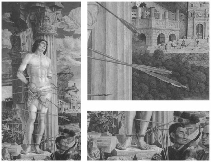 Расстрелянный за верность христианству древнеримский воин изображен на фоне развалин античного храма, которые могут быть поняты вполне официозно – как отринутое им и обреченное на гибель язычество. Но композиция Мантеньи (одержимого античностью великого художника-гуманиста, неутомимого археолога и собирателя древностей) может толковаться и прямо противоположным образом: как метафора культуры, которая стала жертвой нетерпимости, невежества, насилия – и осталась жива, как Себастьян, которого не смогли погубить стрелы язычников. Неслучайно рифмуется стопа христианского святого с мраморной стопой, оставшейся от языческой статуи. Глубокого смысла исполнена и изображенная на заднем плане жизнь, продолжающаяся среди руин античных храмов. И с горьким сарказмом написаны лучники Диоклетиана в облике итальянцев-христиан XV века.