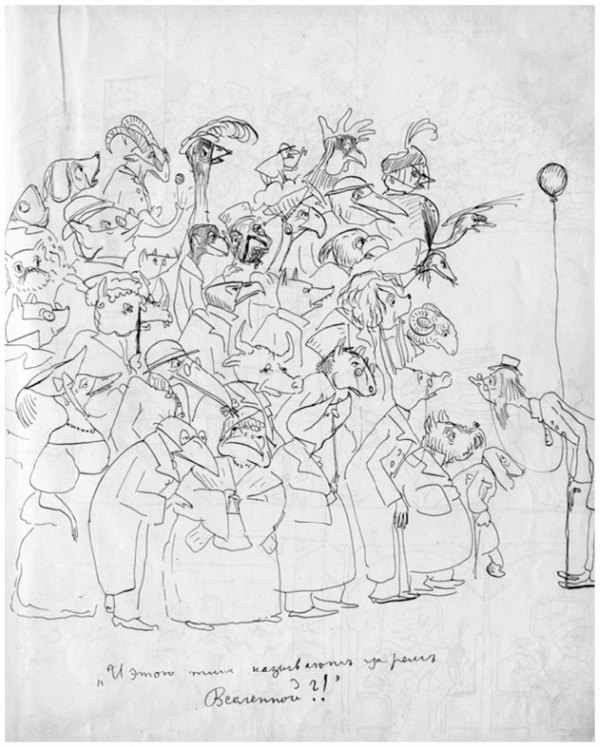 Предыстория образа «смехотворно маленького доктора» (писатель нашел замечательно точные слова для облика этого персонажа) связана, возможно, с одним из рижских рисунков Рорика Эйзенштейна. Им открывается его сохранившаяся, к счастью, рисовальная тетрадь 1913 года: «пай-мальчик из Риги» вместе с изумленными животными задает сакраментальный вопрос о Человеке, претендующем на роль Царя Вселенной.