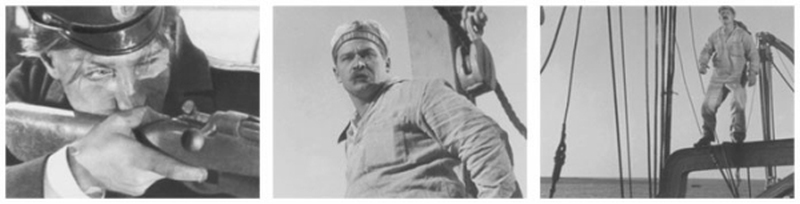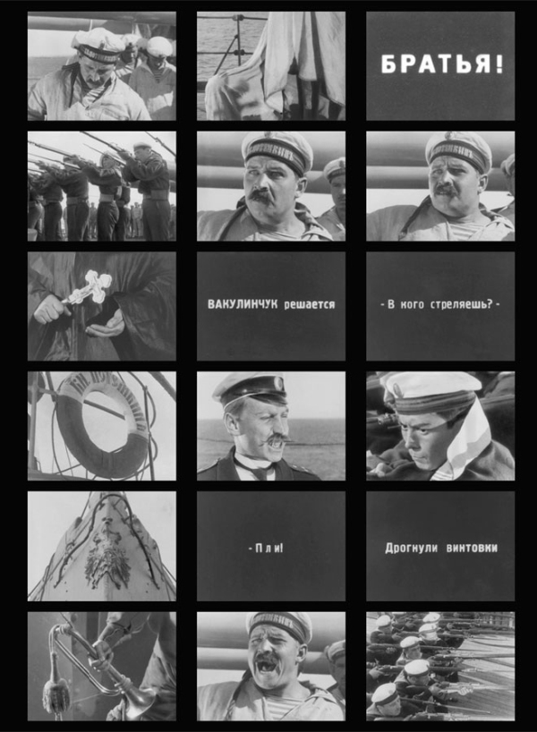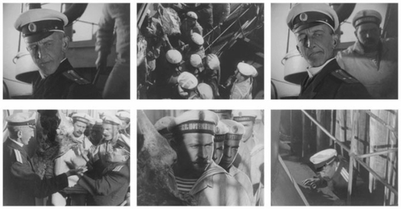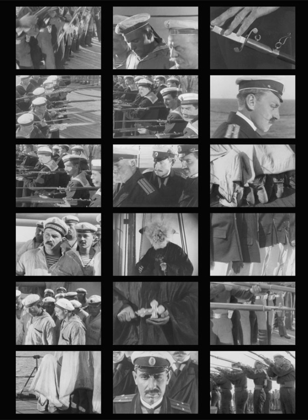 Отдельно скажем о первом изображении четвертого столбца. Это самый длинный кадр отрывка (хотя он длится меньше четырех секунд). В начале Вакулинчук, как и другие матросы – часть их видна в глубине, – стоит, бессильно понурившись, затем начинает медленно поднимать голову.