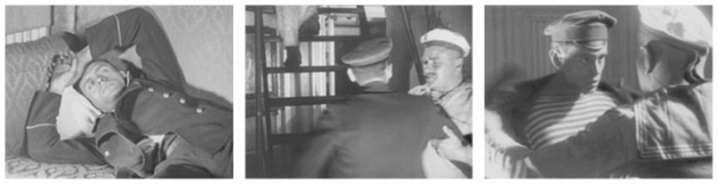 При двух первых появлениях, в гамаке матросского кубрика и в столовой, Новобранец – чуть ли не раб, поначалу безропотный, затем тихо озлобленный, его можно безнаказанно ударить, обругать, унизить. Социальная опасность такого отношения офицеров и вообще господ к бесправным «служивым» и подданным, едва намеченная ударом боцмана и проступившая наружу в коллизии с червивым борщом, прорвется ответным насилием при жестоких попытках силой усмирить протест – на юте, на лестнице, на флоте, вообще в стране.