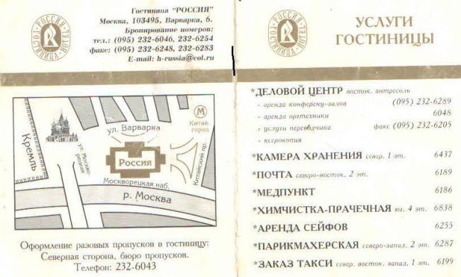 У входа в метро на ступенях сидели бомжи, жалкие и опустившиеся люди с испитыми лицами. Взяв проездные билеты, спустились в метро и с пересадками доехали до площади Ногина. Разглядывая изменившуюся Москву, мы очутились перед мечтой всех кавказских мужчин − гостиницей “Россия”! Это была крупнейшая гостиница Европы с пятью шикарными ресторанами в северном и западном корпусах, с богатым выбором блюд восточной и европейской кухни. Нескончаемое количество кафе и баров, обслуживающих клиентов, как нам казалось тогда, по первому разряду, работали негласно до последнего клиента. По советским меркам, когда ничего лучше и не было, нас и это устраивало. Жадные администраторши в гостинице обкрадывали нас, угрожая выселить. Те, кто убирали номера, лазили по чемоданам и стучали коридорным, если мы приводили девушек. Девицы обходились нам в те времена, можно сказать, бесплатно, ни о каких деньгах не могло быть и речи. Надо было накрыть только стол и все. Устраивал нас, бедных студентов, в отель наш друг − бакинец, который крутил роман с дочкой ответственного работника управделами ЦК. С метро “Ногина”, которое теперь, оказывается, называется “Китай-город”, можно было попасть в восточный корпус отеля. Проблем, на удивление, с размещением никаких не было. Нас, в отличие от прошлых лет, встретили без таблички “мест нет”, мило улыбнулись, представив прайс-лист. Цены оказали более чем скромными, тридцать восемь долларов за номер. Мы собирались остаться на одну ночь и, оплатив проживание, получили ключи и небольшой согнутый пополам глянцевый листок бумаги, на котором большими буквами было написано РОССИЯ № А 471807.Это была карта для предъявления при входе в гостиницу и которая давала право находиться в Москве. В советское время этот глянцевый пропуск переходил из рук в руки, он позволял посещать многочисленные рестораны и бары внутри здания. У словоохотливой милой администраторши выяснили, что отель взят в аренду какой-то итальянской фирмой и скоро может быть даже снесён. С этим мы не могли согласиться. Как ни как, память не одного поколения любителей весело и с комфортом отдохнуть. Поселили нас в южном корпусе на двенадцатом этаже с видом на Москворецкую набережную. Номер был точно такой, как и в годы молодости, даже пахло также, как-то по-особому.
