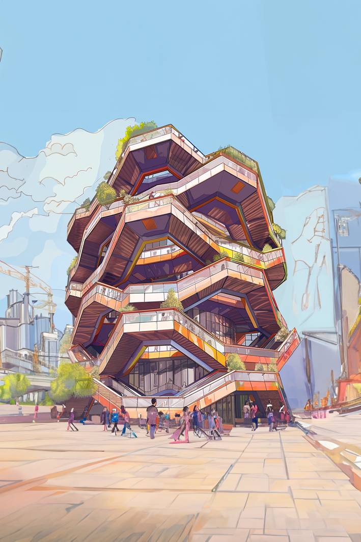 В суетливом городе Нью-Йорк есть волшебный замок в форме пчелиных сот, который называется Вессел. Это не похоже на любой замок из сказок: вместо башен и драконов здесь 154 лестницы и 16 этажей, ведущих ввысь, к небесам! Вессел был создан как особая игровая площадка для людей, чтобы исследовать её, видеть город с высоты птичьего полёта и веселиться, поднимаясь по её многочисленным лестницам.