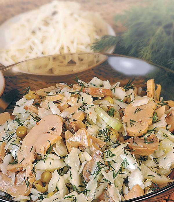 2. Капусту перемешать с грибами, зеленым горошком, сельдереем и зеленью укропа.