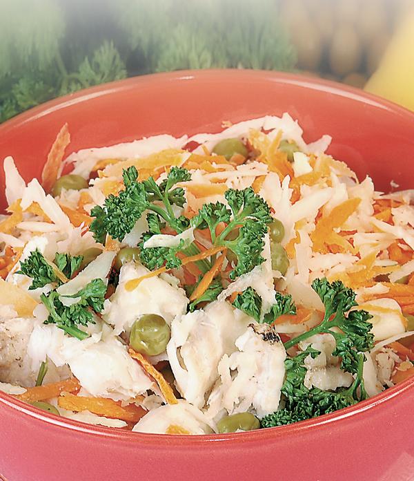 4. Филе судака перемешать с морковью, капустой и зеленым горошком.