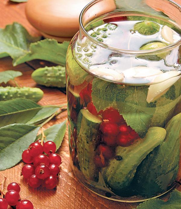 1. Огурцы с плотной мякотью, плоды смородины, очищенные зубчики чеснока, зелень тщательно вымыть в холодной проточной воде. Огурцы замочить в холодной воде на 2 ч. Зубчики чеснока и зелень мелко нарезать.
