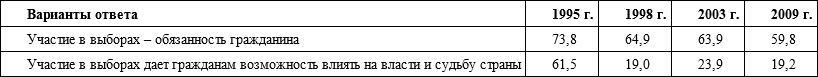 Общественное мнение испытывает разочарование в политике и, хотя еще сохраняет приверженность к демократии, негативно относится к политической жизни. В целом политика рассматривается как затхлая коррумпированная область господства элиты, от которой общество не видит ничего хорошего. Основная форма участия граждан в политике – выборы, и их отношение к участию в них как к гражданской обязанности подчеркивает отсутствие уверенности в том, что можно реально влиять на происходящие события. Это подтверждается результатами исследования, проведенного в 2009 г. Социологическим центром РАГС, на тему «Социально-политические ценности в массовом сознании российского общества».