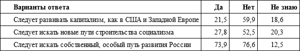 Возможно определенную сумятицу в правильное понимание того, есть ли у нас идеология и что она собой представляет, внесла ст. 13 действующей Конституции Российской Федерации. Части 1–3 этой статьи гласят, что «никакая идеология не может устанавливаться в качестве государственной или обязательной», что в Российской Федерации признаются «политическое многообразие, многопартийность». Прежняя, коммунистическая идеология перестала доминировать в обществе, превратившись в одну из идеологий. Причем далеко не большинства. Но и либеральные взгляды, отражавшие в 90-е годы западную точку зрения, также не прижились в России и не стали идеологией большинства. А главное, ни та, ни другая не способны дать России систему идеологических взглядов, адекватных современным вызовам. Согласно проведенным Социологическим центром РАГС в 2009 г. исследованиям, половина опрошенных россиян считает, что Россия должна искать собственный путь развития.