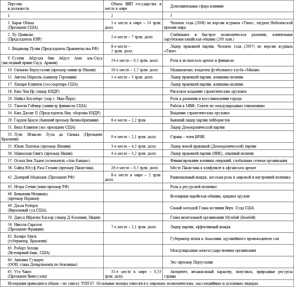 В списке 40 влиятельных экономических, массмедийных и духовных мировых лидеров представлены: граждане США – 15 глобальных лидеров, Азии – 12, Европы – 6, арабо-исламского ареала – 4, Латинской Америки – 2 глобальных лидера. Россия Восточная Европа в этой части рейтинга не представлены, что косвенно свидетельствует об их недостаточной активности. Понимание значения рейтингов глобальных лидеров в различных сферах мировой политики, особенно новых (информационных, технологических), – может способствовать разработке реалистических концепций геополитики и рациональной внешней политики Российской Федерации.