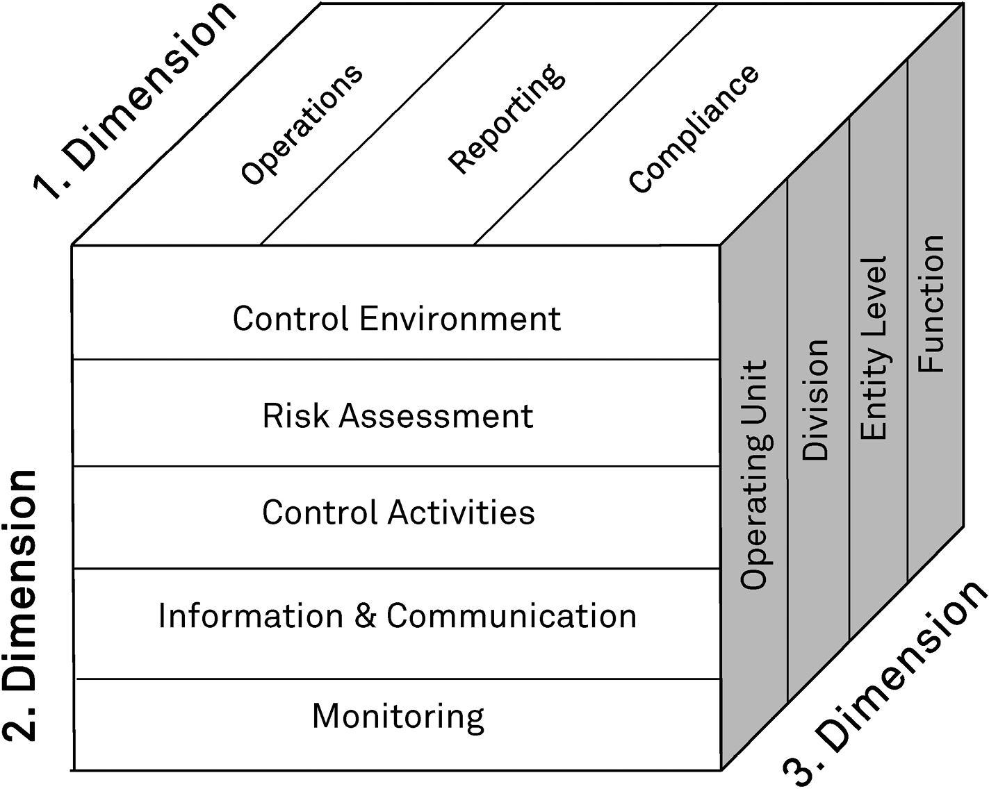 COSO defines three objectives of an ICS: (i) the effectiveness and efficiency of business processes (operations), (ii) the reliability of financial reporting and (iii) compliance with valid laws and regulations. The term ‘internal control’ is defined as the sum of all institutions that are required to ensure the achievement of these three categories of objectives (1. Dimension). Institutions are divided into five components: control environment, risk assessment, control activities (in the sense of management), information and communication, and monitoring (2. Dimension). The three categories of objectives and all five components are applied at both the corporate level as well as to all areas and/or activities of an organisation (3. Dimension). A graphic representation of the three dimensions is given in Figure 1. The components of the second dimension are explained in more detail below.[49]