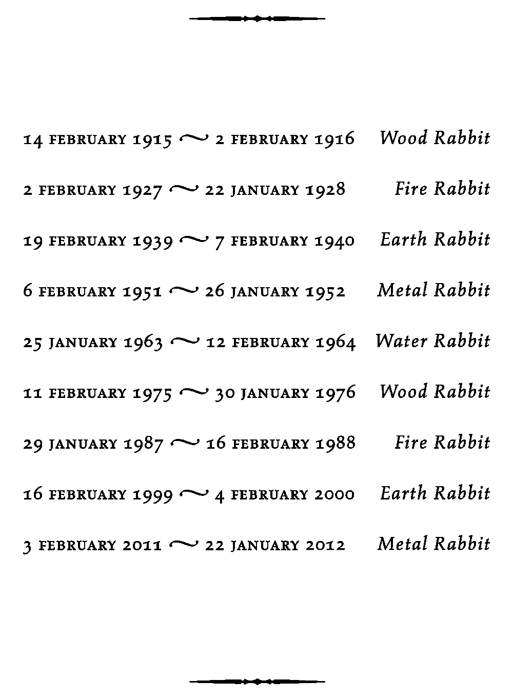 The Rabbit is born under the signs of virtue and prudence. He is intelligent, well mannered and prefers a quiet and peaceful existence. He dislikes any sort of unpleasantness and will try to steer clear of arguments and disputes. He is very much a pacifist and tends to have a calming influence on those around him. He has wide interests and usually a good appreciation of the arts and the finer things in life. He also knows how to enjoy himself and will often gravitate to the best restaurants and nightspots in town.