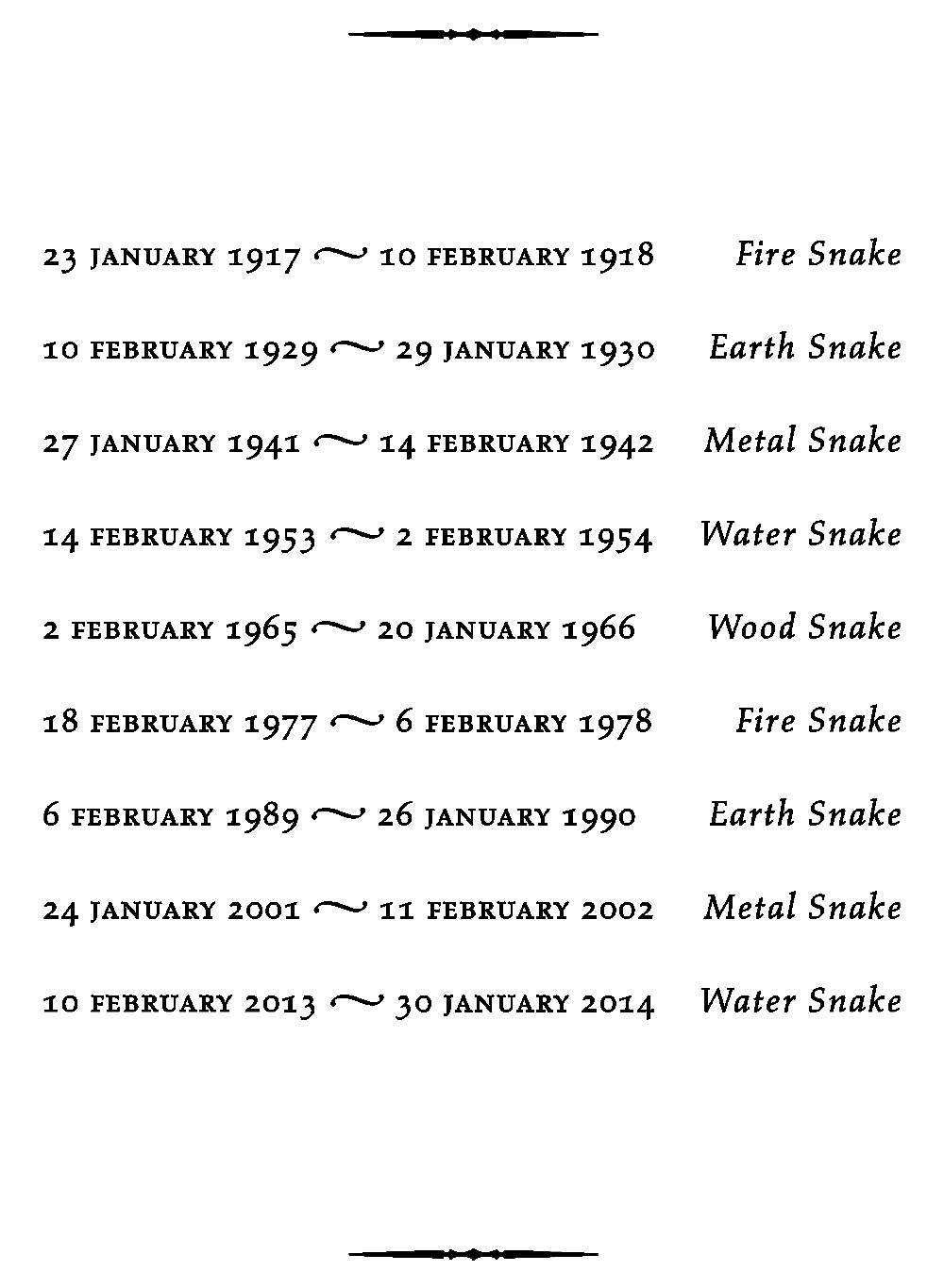 In addition to the 12 signs of the Chinese zodiac there are five elements and these have a strengthening or moderating influence on the signs. The effects of the five elements on the Snake are described below, together with the years in which they were exercising their influence. Therefore Snakes born in 1941 and 2001 are Metal Snakes, Snakes born in 1953 and 2013 are Water Snakes, and so on.