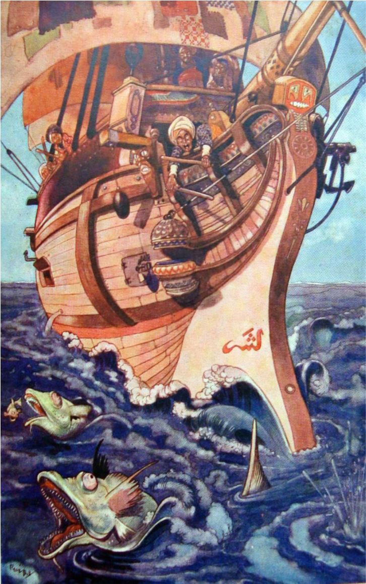 ‘Kaptan, şimdi sözlerimi dikkatle dinle, gerçeği kendin de anlayacaksın. Yalan söylemek ve hile yapmak riyakârların işidir.’ Ve ona Bağdat’tan birlikte yola çıktığımızı, balık adaya gelişimizi, neredeyse boğulmak üzere olduğumuzu anlattım. Dahası, yolculuk sırasında birlikte yaşadığımız birkaç olaydan bahsettim. Bunun üzerine kaptan da tüccarlar da hikâyemin doğruluğuna ikna olup beni tanıdılar ve kurtuluşuma sevindiler. Bana: