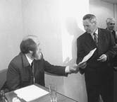 Александр Исаевич вручает Валентину Григорьевичу уникальную папку лауреата. (Фото Дениса Тамаровского)