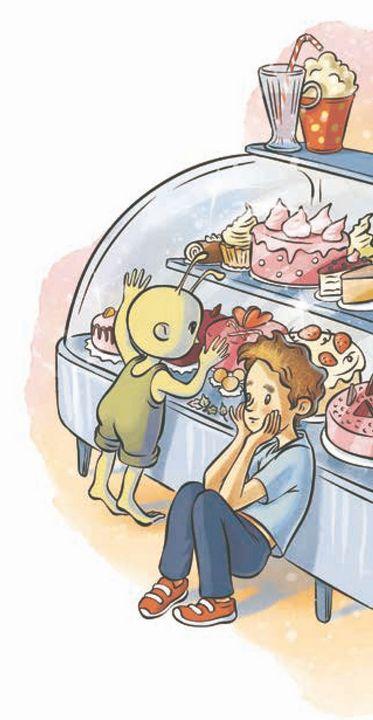Он оглянулся на маму и папу – они сидели, как обычно уткнувшись в свои телефоны, и совсем не смотрели в их сторону. Тогда Коля схватил маленького инопланетянина за руку и потащил его к двери. Они прошмыгнули внутрь и попали туда, откуда появлялись Очень Вкусные Торты, – на кухню.