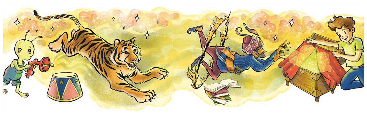 Пришлось Коле пойти в постель, хотя спать ему совершенно не хотелось. Во всяком случае, он был в этом уверен до тех пор, пока мама не начала читать им перед сном. Книжка была про цирк и про укротителей тигров. На первой странице тигры нападали на людей и кусали их. Было даже немножечко страшно. На второй странице тигры уже послушно прыгали с тумбы на тумбу и через кольцо. А что было на третьей странице, Коля так и не узнал, потому что заснул.