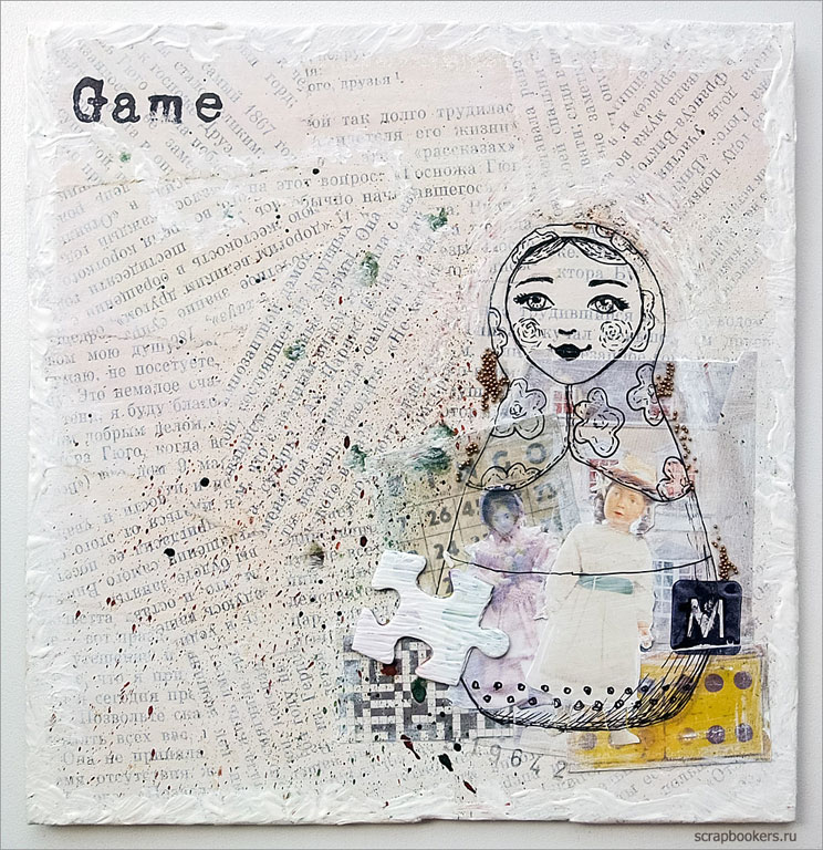 Впечатления последних двух дней накладываются одно на другое, и за каких-нибудь пятнадцать минут рождается новая страница. Фоном служат наклеенные как попало вырезки из газеты, которые я замазываю сверху белым акрилом так, что прочесть текст нельзя, хоть и видны строчки. Сушу страницу феном и добавляю в правую нижнюю четверть несколько элементов: деталь пазла, нарисованную доминошку, символический кроссворд с крохотными клеточками, ребус, и поверх всего этого рисую матрешку черной гелевой ручкой с тонким стержнем. Чего-то не хватает. Руки тянутся к коробке с алфавитными штампами. В противоположном углу сама появляется надпись из четырех букв: