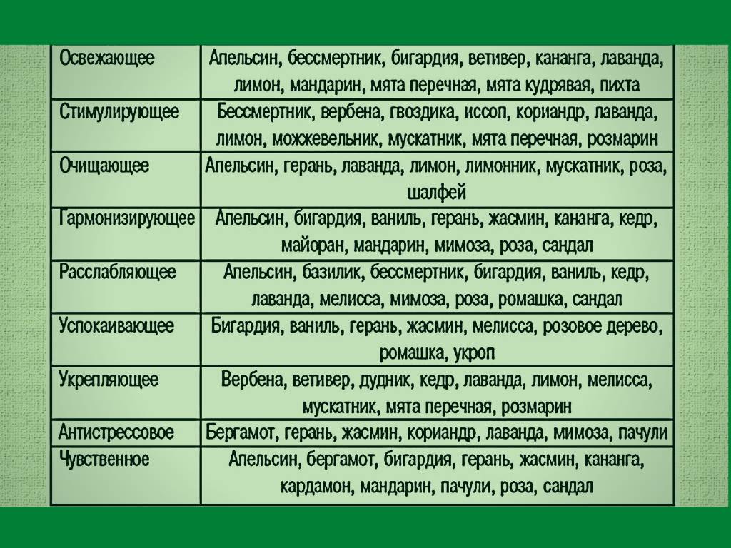 Обратите внимание, что при наличии аллергии стоит применять этот метод с особой осторожностью. Эта таблица поможет вам подобрать запах в соответствии с ситуацией.