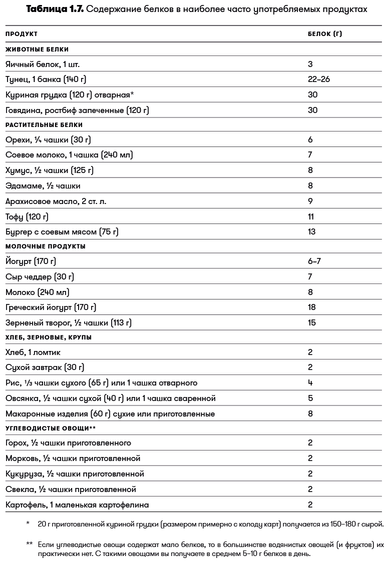 Для большинства людей, включая любителей спорта, дневная порция (150–200 г) богатой белками пищи плюс белки, поступающие с двумя-тремя порциями коровьего или соевого молока, йогурта или сыра (которые вы употребляете ради кальция), обеспечивают достаточное поступление белков в организм. Порция в 150 г – это намного меньше, чем стандартные для большинства американцев 300 г стейка, 180 г куриной грудки, кусок ростбифа за один прием пищи. Многие спортсмены поглощают требуемую норму уже к обеду, а к ужину успевают съесть в два раза больше необходимого. Избыточные белки не превращаются в рельефные мышцы.