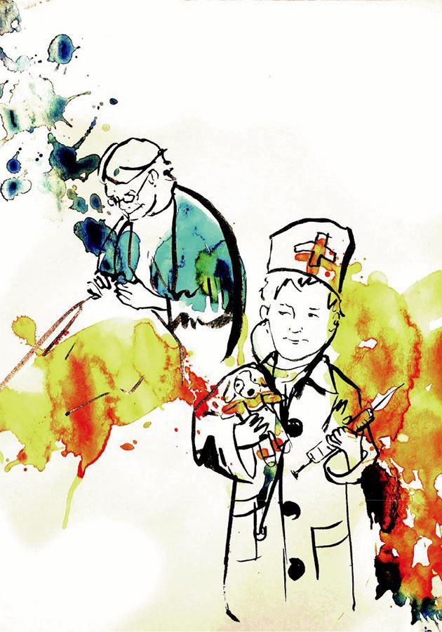 В комнатах были кабинеты приёма, и я с деловым видом шнырял из комнаты в комнату в белом халате. В туалете была лаборатория, в ванной – физкабинет, на кухне – прививочная, в кладовке – гардероб, а в коридоре ожидали больные. Для них я даже пытался выпускать санбюллетень с вырезками из журналов «Здоровье». Кстати, я очень любил их рассматривать в то время. Первыми моими пациентами были моя прабабушка и игрушечная собака Тишка, подаренная мне на четырёхлетие. С прабабушкой мы обсуждали статьи из журнала «Здоровье». Я понарошку слушал её и ставил уколы, брал кровь и выписывал направления на анализы, рецепты на лекарства. Бабушка играла со мною на полном серьёзе. И рассказывала случаи из своего анамнеза: как её лечили морфием или как болели её дети, как вместо банок при пневмонии она ставила своему сыну на спину гранёные рюмки. Много чего рассказывала, а я лежал на её коленях, слушал и засыпал, пока она чесала мне спинку.