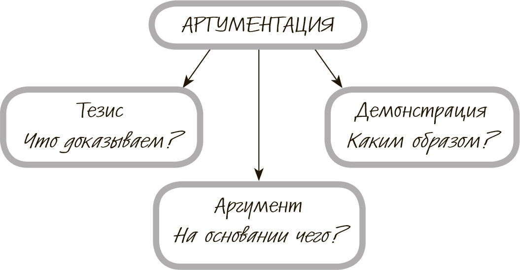 Такова структура аргументации. В ее классической теории вы сможете найти формулировку «структура доказательства». Доказательство и аргументация – понятия схожие, иногда даже синонимичные, однако первое по сравнению со вторым представляет собой более строгую и жесткую процедуру, регулирование которой осуществляется в соответствии с рациональными законами логики. Аргументация всегда более индивидуализирована, диалогична и ориентирована на реципиента. Выбор тех или иных ее средств и приемов будет зависеть от определенной ситуации, конкретного реципиента, его коммуникативного поля опыта, того или иного контекста, субъективных и объективных барьеров коммуникации и т. д. (обо всем этом рассказывается в первой главе моей книги «Гни свою линию»). Тем не менее в любой аргументации будут представлены точно такие же структурные элементы, как и в классическом доказательстве: тезис, аргумент, демонстрация. Таким образом, все проанализированные выше элементы аргументации в полной мере относятся и к доказательству, рассматриваемому классической логикой.